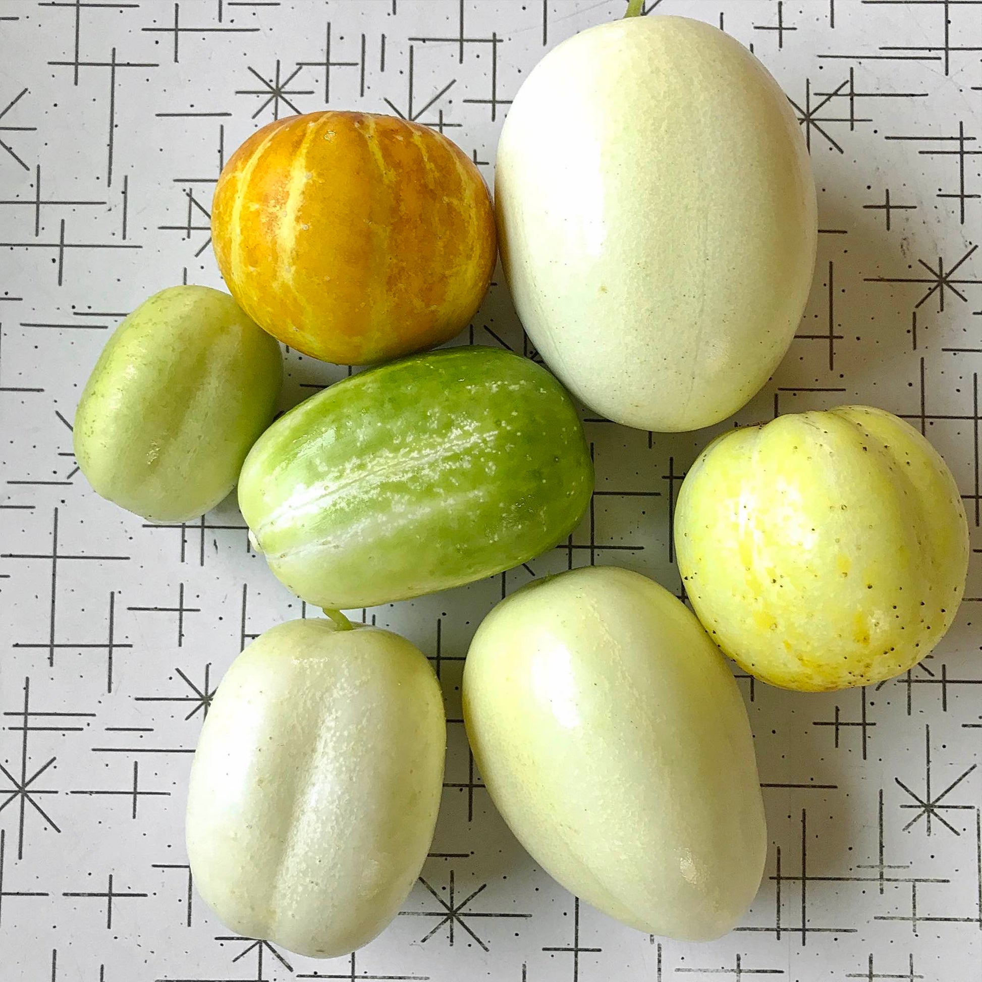 I had an idea for a new apple cucumber variety so I first set out to create some diversity by combining the ones I could most easily find - Lemon, Richmond Green Apple, Crystal Apple, and Dragon's Egg. I'm making light selections for disease resistance and earliness, but am mostly focused on encouraging the colours and shapes to co-mingle.