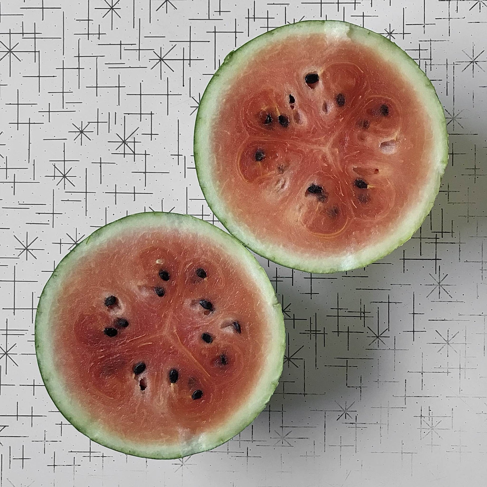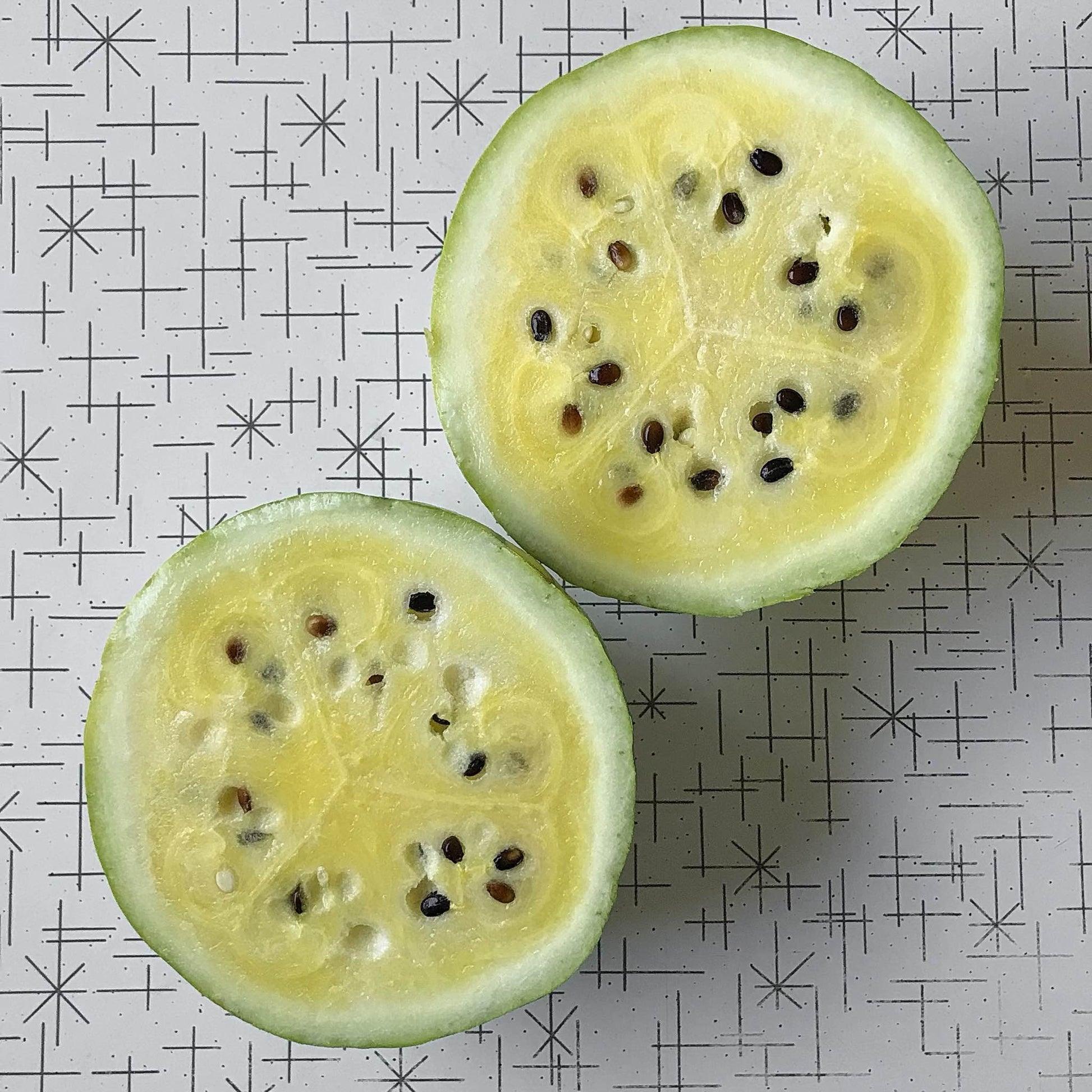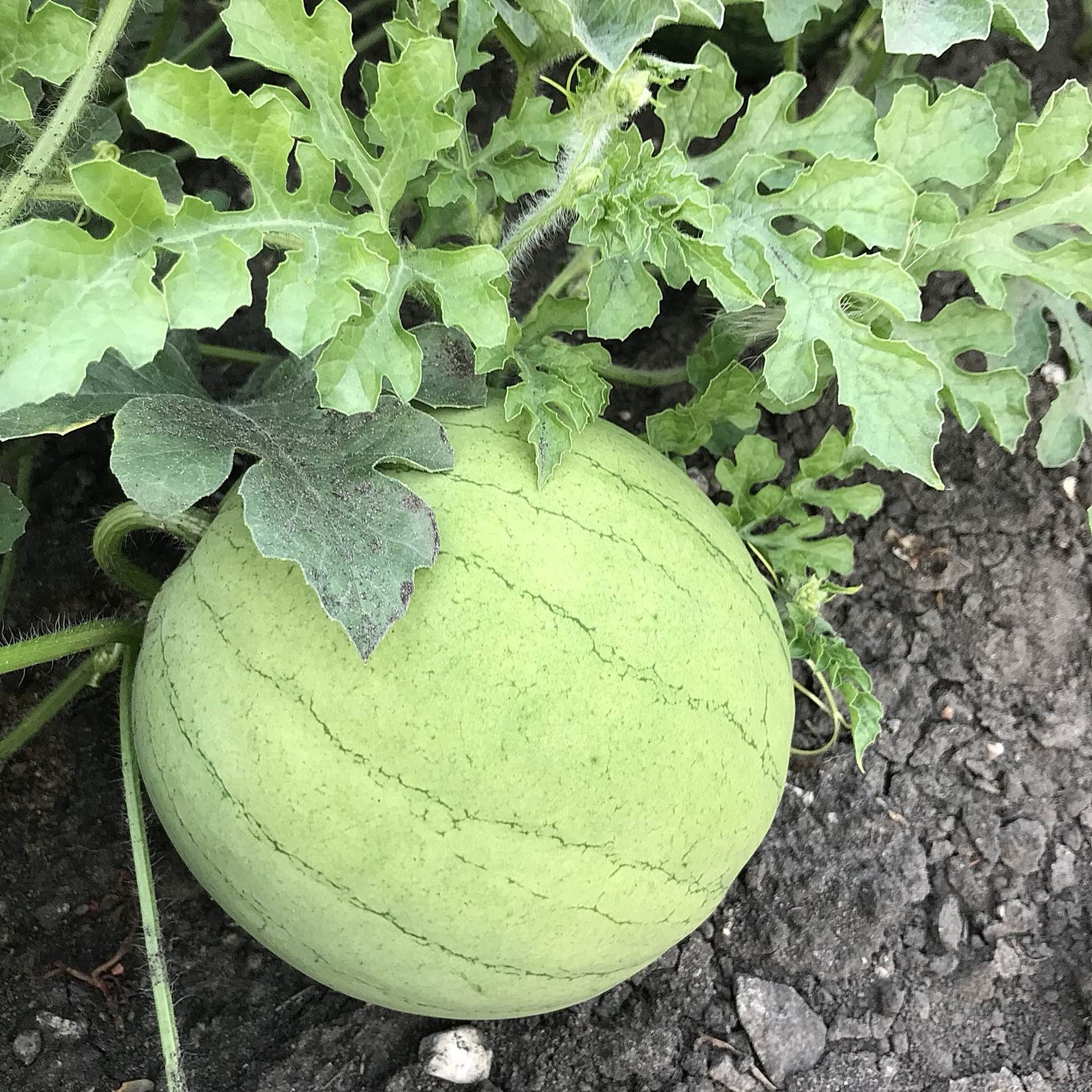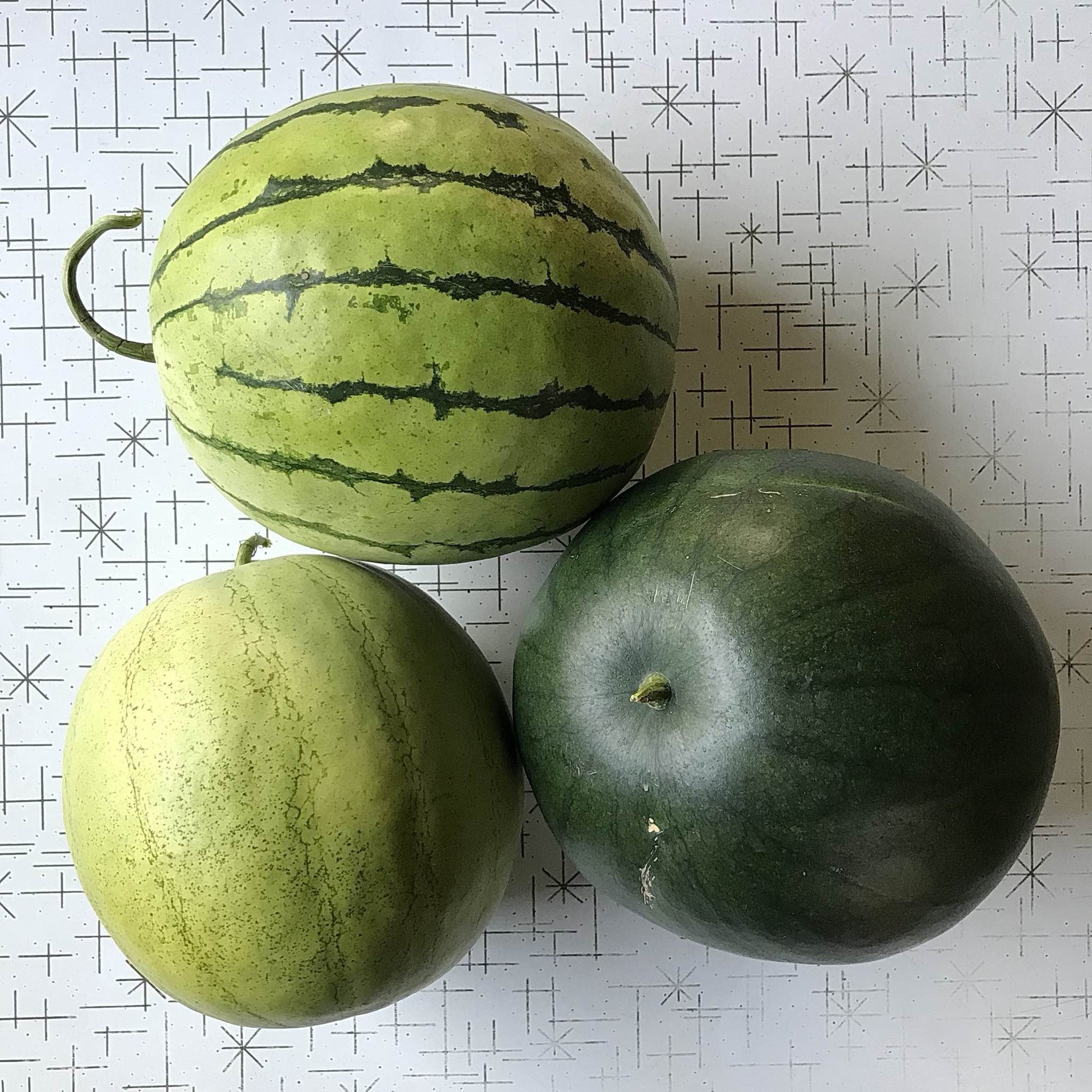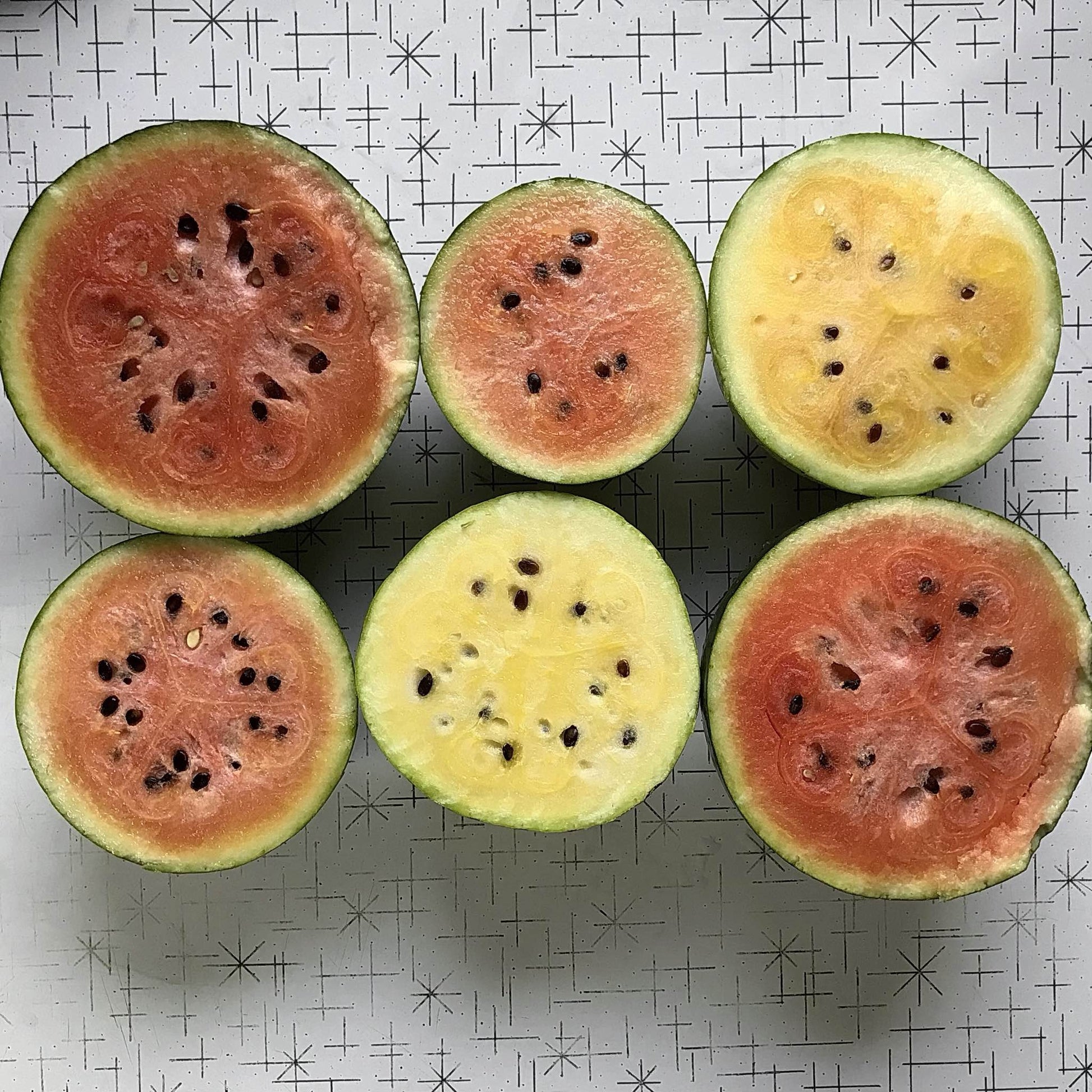A free-wheeling three-melon grex comprised of the varieties Blacktail Mountain, Early Moonbeam, and Sugar Baby. Early and cool weather tolerant like its parents, this breeders mix produces round fruits in a variety of sizes, averaging about 8 lbs with a pretty wide spread of about 5-17lbs. Flesh colours are a mix of red, yellow and orange.